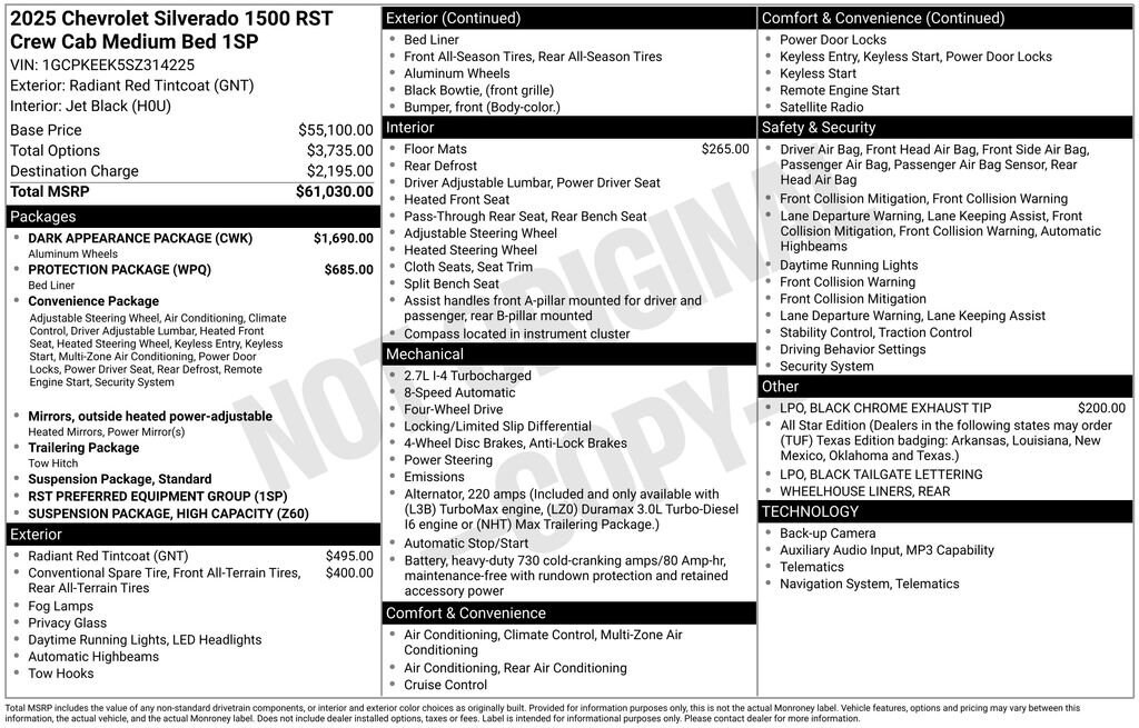 Dressed to thrill, our 2025 Chevrolet Silverado 1500 RST Crew Cab 4X4 delivers a dynamic design with performance to match in Radiant Red Tintcoat! Motivated by a 2.7L TurboMax delivering 310hp to an 8 Speed Automatic transmission. This Four Wheel Drive truck also features an auto-locking rear differential for sure-footed capability, and it sees nearly 20mpg on the highway with bold RST details. A black Bowtie highlights the grille, complementing LED lighting, fog lamps, a power lock/release EZ Lift tailgate, a spray-on bedliner, 20-inch alloy wheels, LED bed lighting, and painted mirror caps.