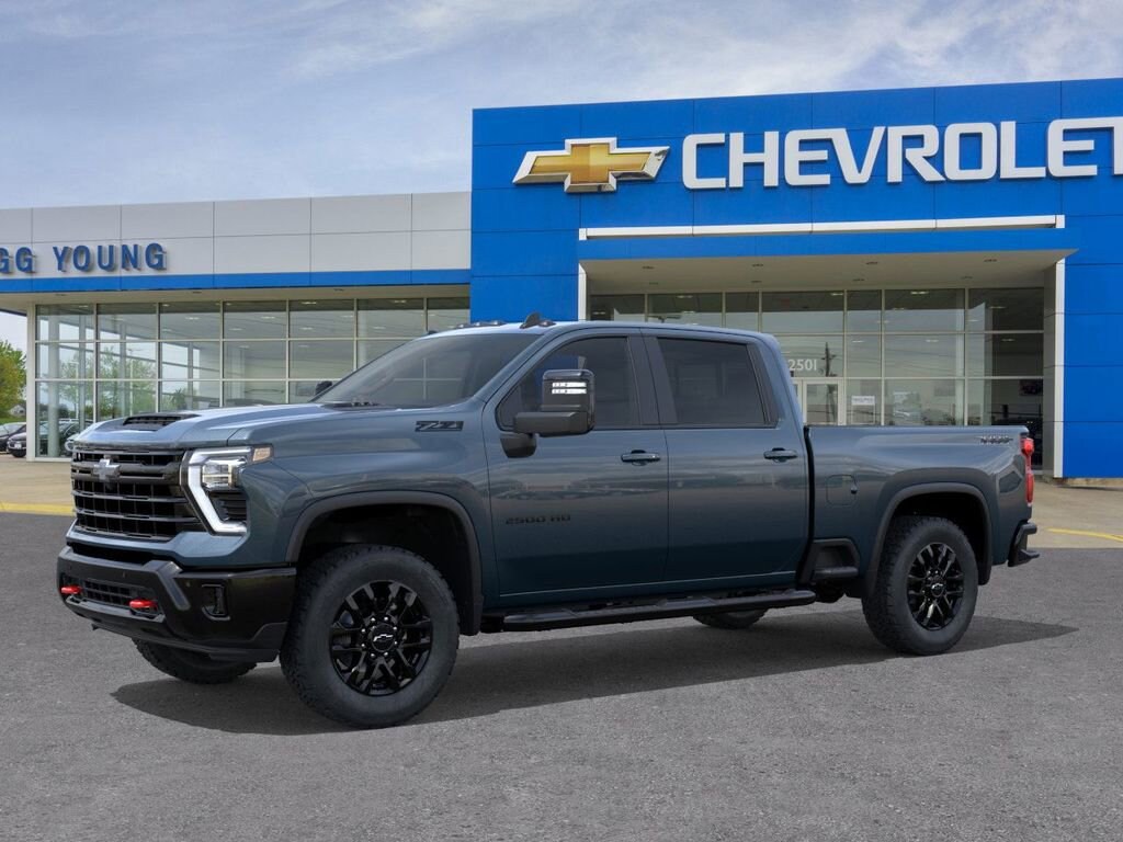 Ready to tackle any job, our 2025 Chevrolet Silverado 2500 LT Crew Cab 4X4 with Z71 Off-Road Package rides with terrific truck appeal in Lakeshore Blue Metallic! Motivated by a 6.6 Liter V8 offering 401hp to a 10 Speed Allison Automatic transmission for muscular towing and hauling capabilities. An HD suspension and auto-locking rear differential help you handle hard work without breaking a sweat, and this Four Wheel Drive truck stands strong with an impressive range of standard features. Highlights include chrome bumpers, alloy wheels, power trailering mirrors, an EZ lift and lower tailgate, LED taillamps, side/rear bed steps, a trailer hitch, and cargo-bed lighting.