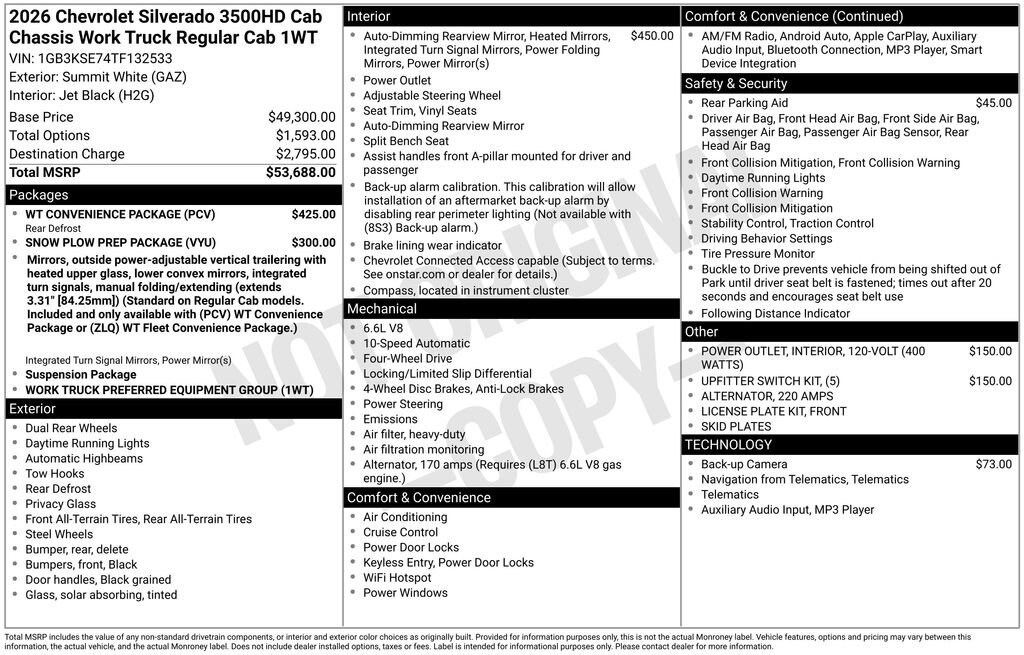 Built to dominate tough tasks, our 2026 Chevrolet Silverado 3500 W/T Regular Cab 4X4 in rugged Summit White is a powerhouse work truck engineered for long days, heavy loads, and serious job site performance. Powered by a 6.6 Liter V8 serving up 401hp matched to a 10 Speed Allison Automatic transmission tuned to help with towing and hauling. An auto-locking rear differential and composed handling give this Four Wheel Drive truck even more confident capability. It's also easy to stand out with our Silverado's black bumpers, black beltline moldings, black-capped power trailer mirrors, a trailer hitch, cargo-area lights, recovery hooks, and rear/side bed steps.