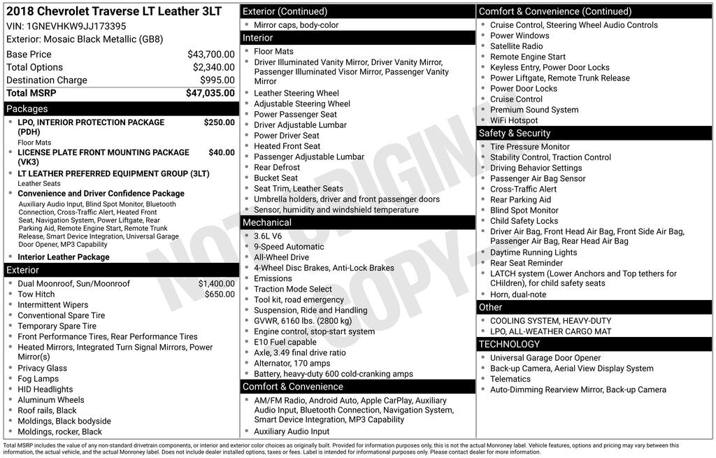 Confident and bold, our Accident Free 2018 Chevrolet Traverse 3LT AWD offered in amazing Mosaic Black Metallic is ready for duty! Powered by a 3.6 Liter V6 that delivers 310hp connected to a 9 Speed Automatic transmission for easy passing and towing. Whether taking the kids to school, commuting to work, or towing that toy on the weekends, our All Wheel Drive SUV is at your service, offering nearly 27mpg on the highway. As you approach our terrific Traverse, you will immediately notice the athletic design, LED lighting, HID headlamps, fog lamps, heated power mirrors, and fantastic alloy wheels.