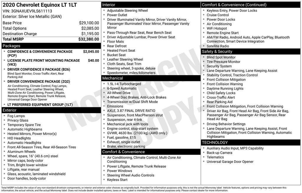 Our stylish **Accident Free**2020**Chevrolet**Equinox**LT**AWD**Confidence & Convenience Package**Heated Seats** stands proud in Silver Ice Metallic. Powered by a TurboCharged 1.5 Liter 4 Cylinder offering 170hp connected to a 6 Speed Automatic transmission for moving through your days with more confidence. This capable All Wheel Drive SUV also rewards you with responsive handling and achieves nearly 30mpg on the highway. Sporty and sophisticated, our Equinox boasts LED lighting, HID headlamps, heated power mirrors, deep-tinted rear glass, and great-looking alloy wheels.Inside our LT cabin, you can settle into comfortable heated cloth seats with eight-way power for the driver, grab the multifunction steering wheel and get ready to go. On the way, enjoy the benefits of air conditioning, power accessories, pushbutton ignition, keyless open, and smart technology to take some of the hassles out of your busy day. It starts with a 7-inch color touchscreen that supports Bluetooth®, WiFi compatibility, Android Auto®/Apple CarPlay®, and a six-speaker sound system. Intelligent storage solutions give you plenty of room for gear, too!Chevrolet focuses on safety by supplying features like a backup camera, automatic braking, lane-keeping assistance, forward collision warning, pedestrian detection, StabiliTrak stability/traction control, and more for your peace of mind. It's the right time of year to ride in our Equinox LT! Save this Page and Call for Availability. We Know You Will Enjoy Your Gregg Young Chevrolet Omaha Test Drive Towards Ownership! We offer PRE-APPROVAL programs so call (402) 572-8080 to get started today! At Gregg Young Chevrolet... We'll Go The Extra Mile For You. We have an app for that! Download the Gregg Young Chevrolet application directly to your iPhone or Android.