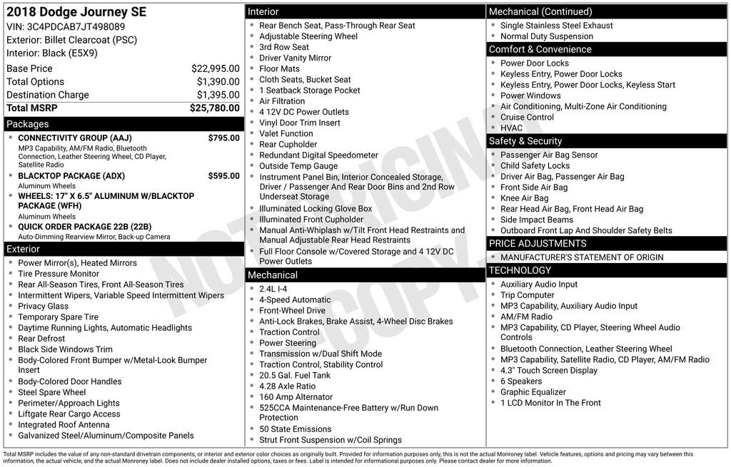 Arrive in style in our 2018 Dodge Journey SE with the Blacktop Package that's presented to you in Billet! Powered by a 2.4 Liter 4 Cylinder that produces 173hp paired with a 4 Speed Automatic transmission that delivers a peppy ride. This Front Wheel Drive SUV can handle practically any road condition while it rewards you with nearly 25mpg on the highway! Our Blacktop Package is accented by 17-inch aluminum wheels, black headlamp bezels, and a black gloss grille, which will make you stand out.