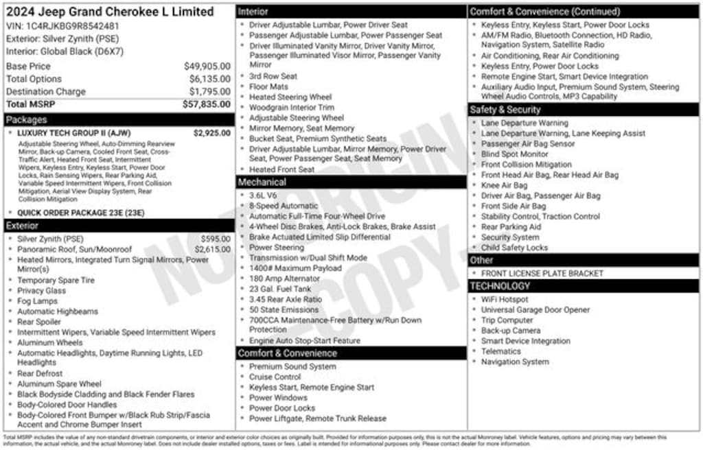 Long and luxurious, our **One Owner**Accident Free**2024**Jeep**Grand Cherokee L**Limited**4X4**Luxury Tech II Package**Sunroof** is here to extend your next adventure in Silver Zynith! Powered by a 3.6 Liter Pentastar V6 supplying 293hp to an 8 Speed Automatic transmission. This Four Wheel Drive SUV also achieves nearly 25mpg on the highway with Selec-Terrain for the trails. Check out our Grand Cherokee L's LED lighting, fog lamps, lower body cladding, bold alloy wheels, sunroof, and our Lux Tech II Pack for a hands-free liftgate.