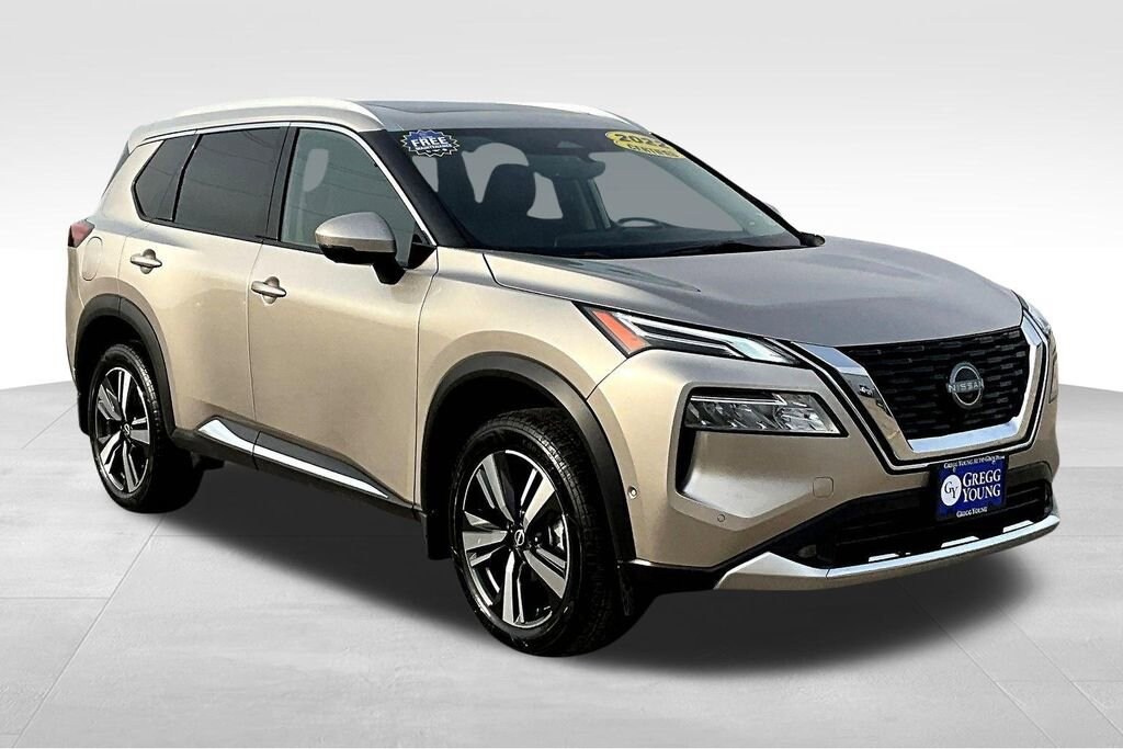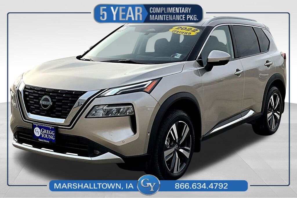 A superior SUV, our One Owner, Accident Free 2022 Nissan Rogue Platinum AWD combines capability and comfort for drivers just like you in Champagne Silver Metallic. Powered by a TurboCharged 1.5 Liter 3 Cylinder offering 201hp to a paddle-shifted CVT with dedicated Sport and Eco modes. This easy-to-maneuver All Wheel SUV also scores nearly 34mpg on the highway with a daring design. You can recognize our Rogue from LED lighting, fog lamps, dual-pane panoramic sunroof, hands-free tailgate, roof rails, rear spoiler, multifunction mirrors, and 19-inch alloy wheels.